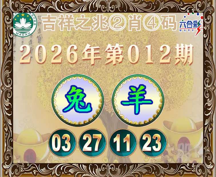 012期:【吉祥之兆】 ✂️②肖④码✂️【兔羊】【03.27.11.23】开:羊11准