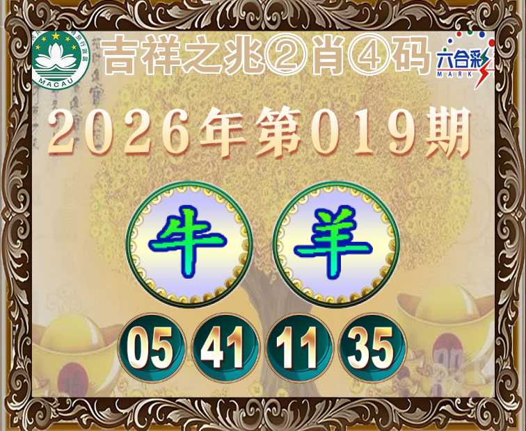 019期:【吉祥之兆】 ✂️②肖④码✂️【牛羊】【05.41.11.35】开:猴46错